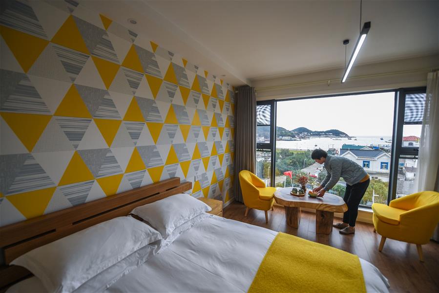 12月15日,工作人員在朱家尖烏石塘“漁夫客棧”民宿客房內(nèi)忙碌。 新華社記者 徐昱 攝