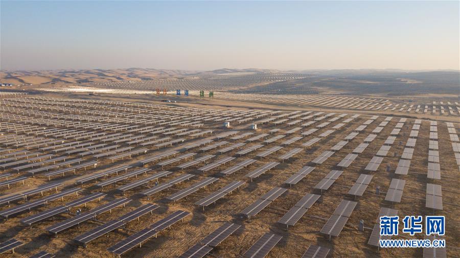位于庫布其沙漠腹地的達(dá)拉特光伏發(fā)電應(yīng)用領(lǐng)跑基地一期500兆瓦項目(12月13日無人機拍攝)。 新華社記者 彭源攝