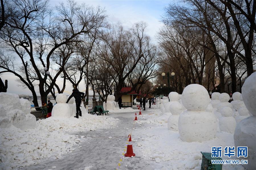 12月17日,雪雕師在松花江畔制作雪雕景觀。新華社記者王凱攝