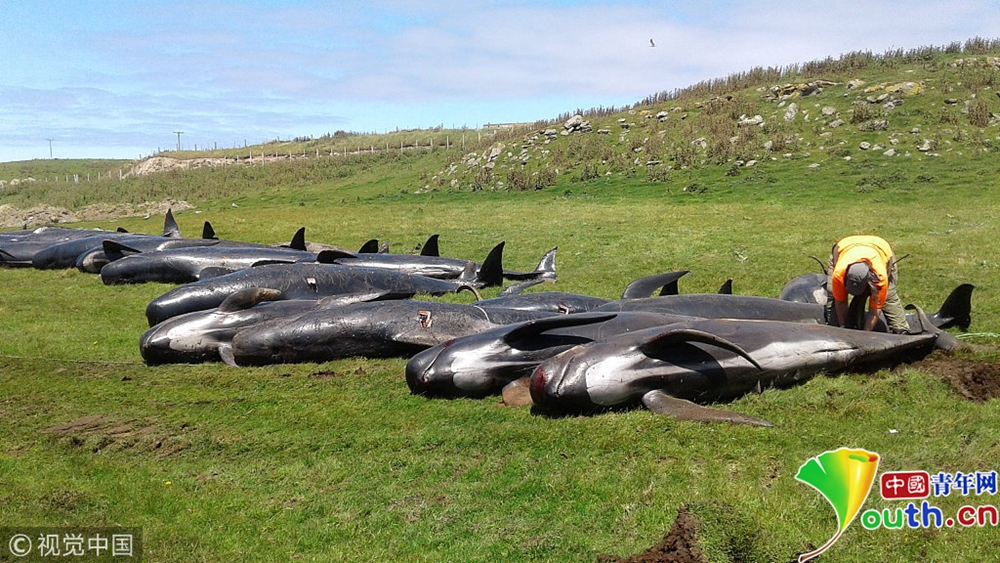 當(dāng)?shù)貢r(shí)間11月30日,新西蘭查塔姆島,多頭巨頭鯨在當(dāng)?shù)睾R淺死亡,尸體被沖上岸。