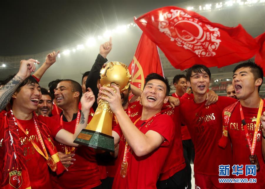 圖為2018年11月7日,上海上港隊(duì)球員武磊(前中)在慶祝奪得本賽季中超聯(lián)賽冠軍的資料照片。 新華社記者丁汀攝