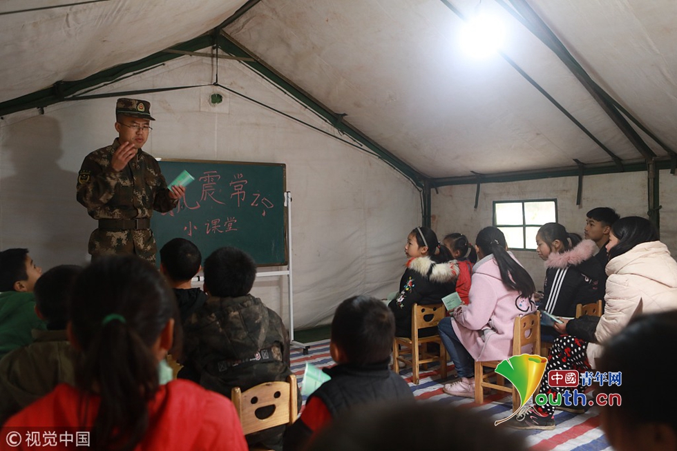 2018年12月18日,四川宜賓。武警宜賓支隊政治工作處宣傳保衛(wèi)股股長朵祝偉為周家鎮(zhèn)新塘安置點的“帳篷學校”的學生上抗震常識課。圖片作者:謝江、劉崇達/視覺中國