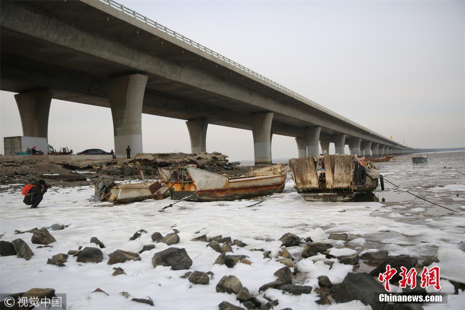 12月9日,受大風(fēng)降溫天氣影響,青島膠州灣北部冰情初現(xiàn),青島西海岸新區(qū)膠州灣跨海大橋入口處海冰層層疊疊,暫未對(duì)海上漁業(yè)生產(chǎn)帶來(lái)影響。張進(jìn)剛 攝 圖片來(lái)源:視覺(jué)中國(guó)