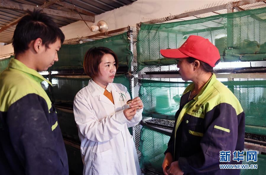 12月18日,馬關(guān)琴(中)在雞苗育雛基地與工人交流。 新華社記者 楊宗友 攝