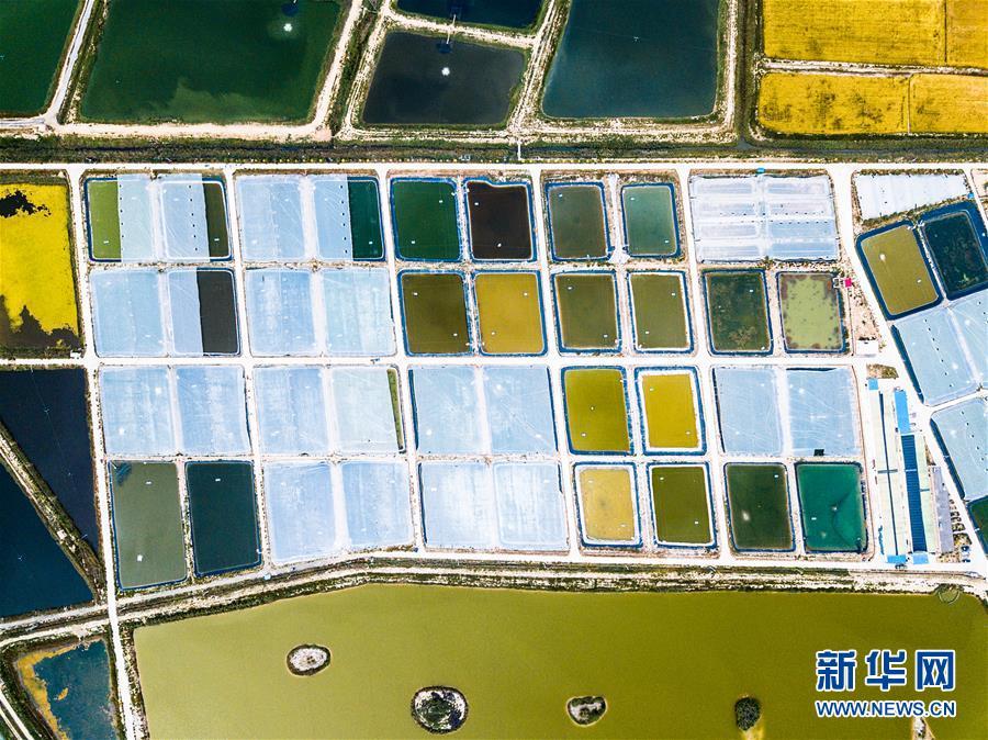 2018年9月11日航拍的寧夏賀蘭縣藍(lán)灣生態(tài)園南美對蝦養(yǎng)殖基地。 大地之色,俯仰之間;壯美山河,是我的祖國。2018年,新華社記者操縱無人機“飛閱”華夏大地,在最美的時節(jié),定格下她的色彩斑斕。 新華社記者 王建華 攝