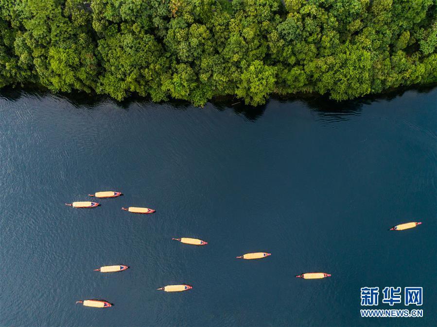 2018年7月23日,游客乘船在新安江浙江建德段江面上游玩。 大地之色,俯仰之間;壯美山河,是我的祖國(guó)。2018年,新華社記者操縱無人機(jī)“飛閱”華夏大地,在最美的時(shí)節(jié),定格下她的色彩斑斕。 新華社記者 徐昱 攝
