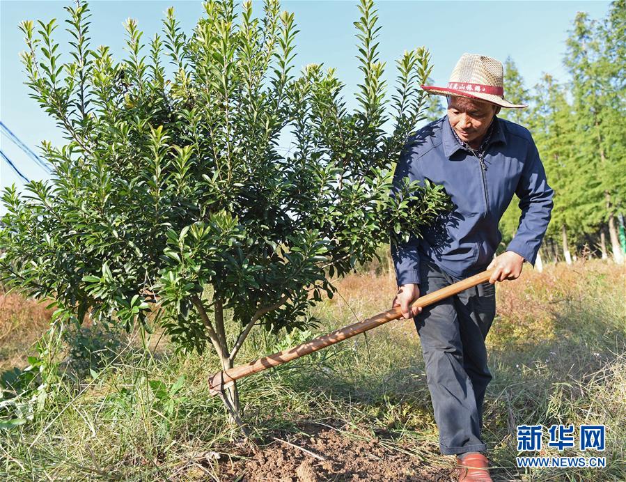 舒港發(fā)在自家田地給楊梅樹除草(10月27日攝)。