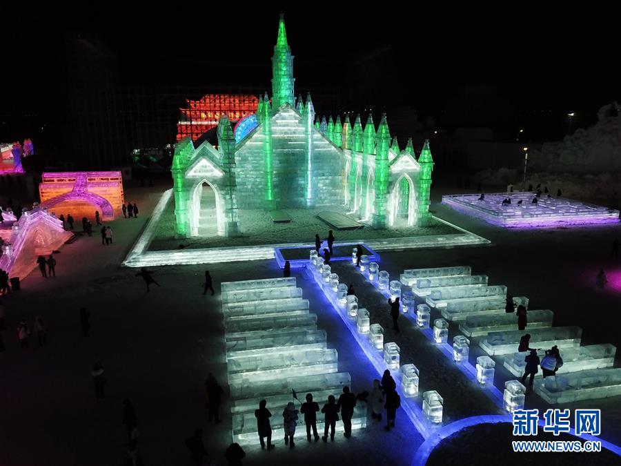 這是哈爾濱冰雪大世界園區(qū)內的一處景觀(12月23日無人機拍攝)。