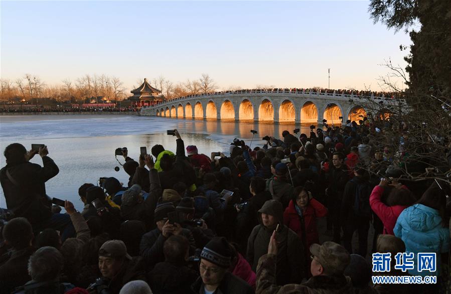 12月23日,游客和攝影愛好者在拍攝頤和園十七孔橋“金光穿洞”美景。 當(dāng)日,北京頤和園十七孔橋出現(xiàn)“金光穿洞”美景,吸引許多游客和攝影愛好者前來觀賞拍攝。 新華社記者陳曄華攝