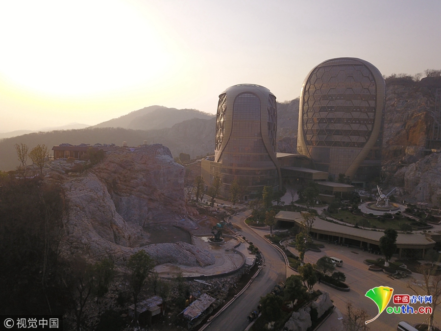2018年12月23日,南京浦口區(qū)老山風(fēng)景區(qū)三河采石場(chǎng)宕口,利用宕口廢棄工地進(jìn)行生態(tài)修復(fù)的蜂巢酒店主體完工。經(jīng)過(guò)100名雕刻工人近半年的施工,酒店兩側(cè)被破壞的山體變成兩只高30多米的巨型山體雕塑石獅,栩栩如生,場(chǎng)面極其震撼。