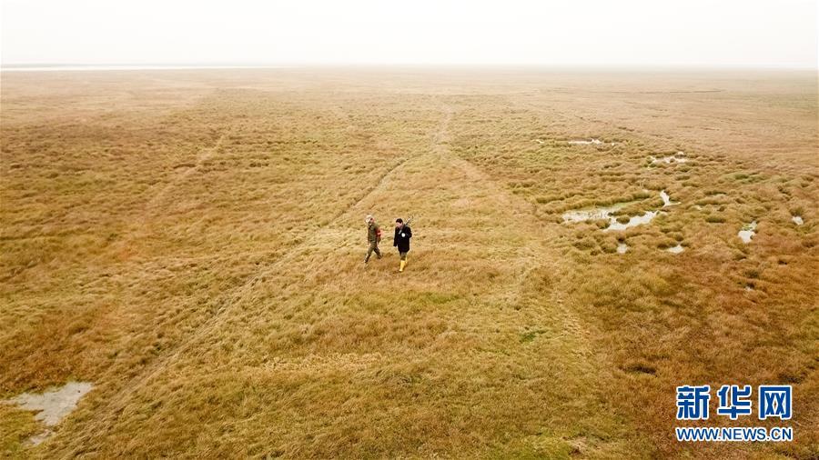 12月22日,王三益(右)和生態(tài)保護協(xié)會成員江軍在菜子湖濕地進行越冬候鳥巡護(無人機拍攝)。每年10月開始,候鳥遷徙至菜子湖,次年3月飛回北方,期間王三益會和協(xié)會成員開展越冬候鳥巡護以及清理濕地灘涂垃圾。