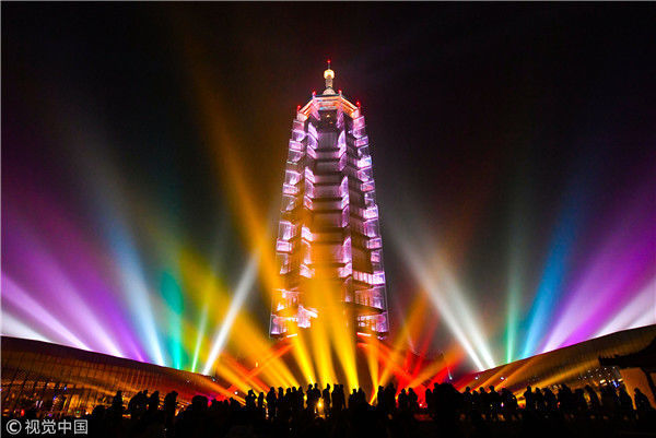2017年12月31日跨年夜,南京,大報恩寺遺址公園內(nèi)的大報恩塔塔身投影出“你好2018”的字樣,眾多市民前來撞鐘,為家人和朋友祈福,迎接新年。