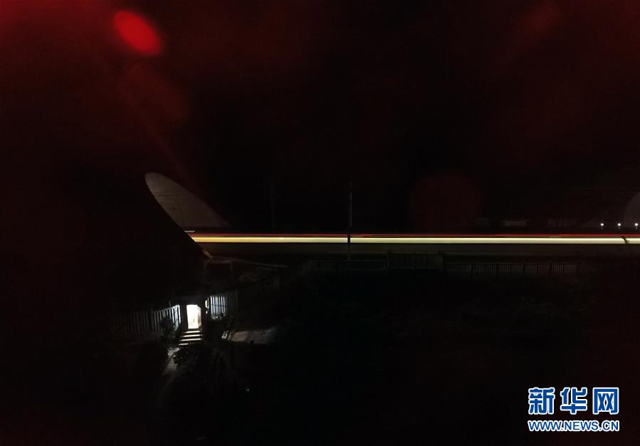 一列動(dòng)車(chē)夜間穿越花甲山隧道進(jìn)入壇柱隧道(左)(2月11日無(wú)人機(jī)航拍)。廣西南寧市前往北部灣沿海城市的鐵路,穿越巍巍群山,列車(chē)飛馳其間需要穿過(guò)大批隧道,僅南寧市到北海市的鐵路隧道就有18個(gè)。