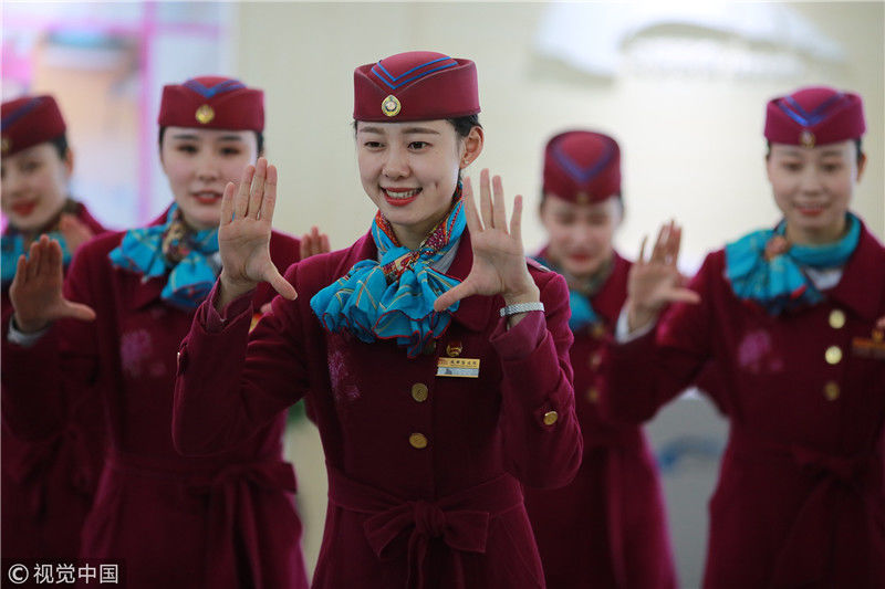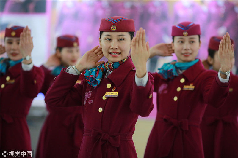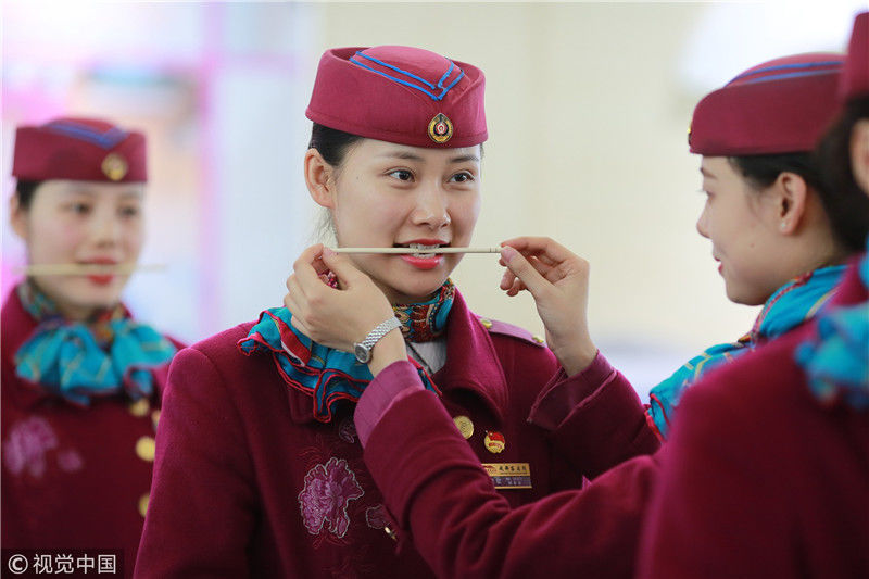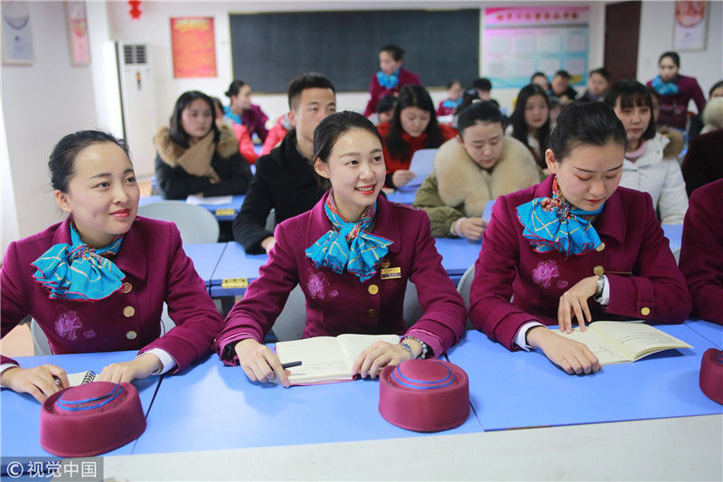 2018年12月27日,四川成都,為備戰(zhàn)即將開通的成雅鐵路,中國鐵路成都局集團有限公司成都客運段動車二隊對成雅動車的乘務人員進行理論、形體、服務禮儀等內(nèi)容的培訓。蘇志剛/視覺中國