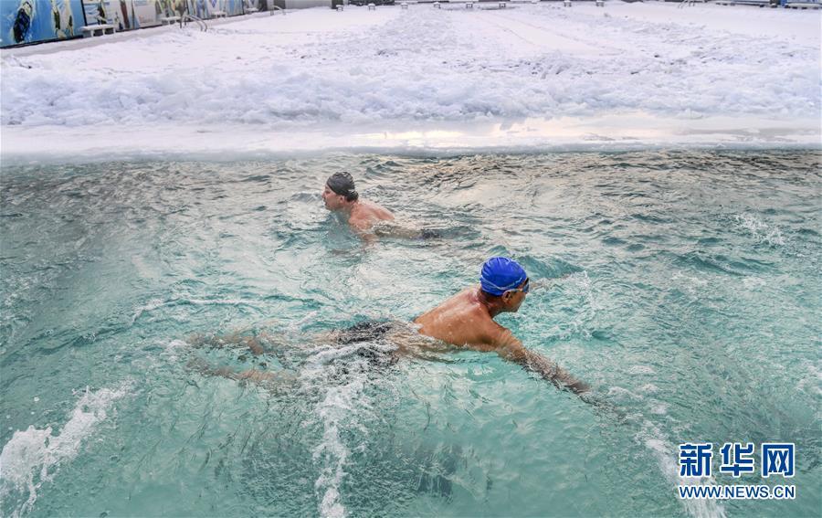 12月28日,冬泳愛好者在烏魯木齊紅山游泳中心游泳。