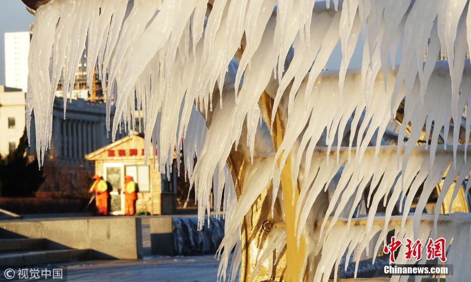 渤海海水在北風(fēng)的作用下涌向岸邊,在大連東港海岸護(hù)欄上凝結(jié)成冰凌,形成約有兩公里的冰凌奇觀。圖為大連市東港海岸護(hù)欄結(jié)滿晶瑩剔透的冰棱。圖片來源:視覺中國(guó)