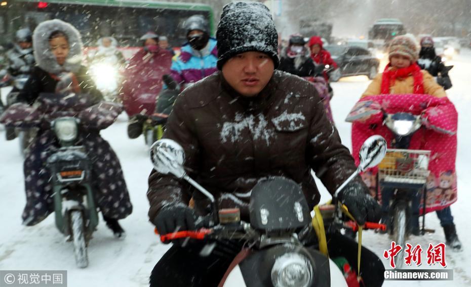 河北石家莊井陘縣縣城,人們?cè)谘┲谐鲂?。受多股冷空氣的持續(xù)影響石家莊出現(xiàn)降雪、降溫天氣。圖片來(lái)源:視覺(jué)中國(guó)