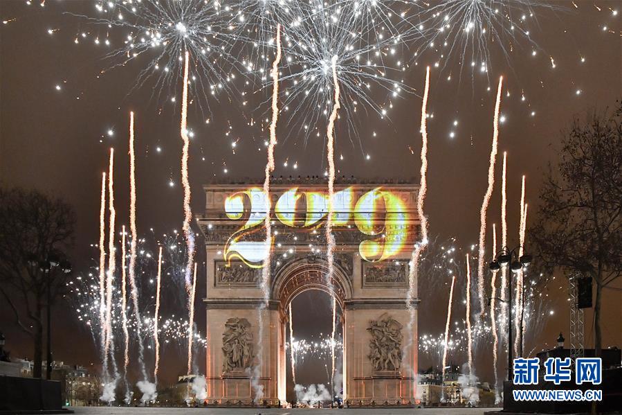 這是1月1日在法國(guó)巴黎凱旋門(mén)拍攝的燈光秀和煙火。 法國(guó)巴黎以在凱旋門(mén)打上投影燈光和放煙火的方式迎接新年的到來(lái)。 新華社記者陳益宸攝