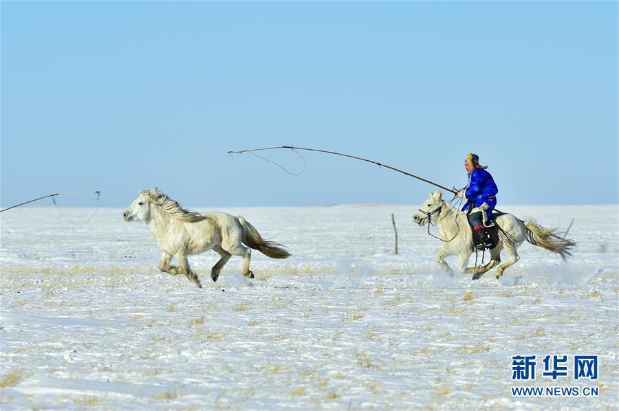 1月8日,牧民進(jìn)行套馬表演。 時(shí)下正值草原冬季旅游旺季,內(nèi)蒙古自治區(qū)西烏珠穆沁旗的牧民們?cè)谘┰弦徽股硎?,為游客展現(xiàn)獨(dú)特的民族風(fēng)情。 新華社記者 鄒予 攝