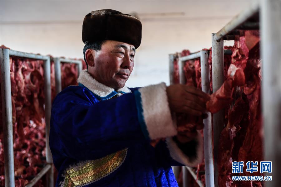 1月9日,牧民伊拉代在查看風(fēng)干牛肉的成色。 新華社記者 劉磊 攝