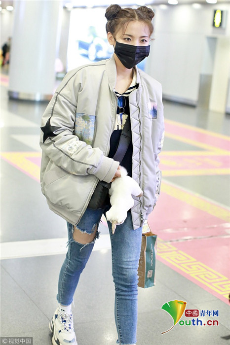 2019年1月14日,北京,楊超越現(xiàn)身機(jī)場(chǎng)。她扎哪吒頭活力十足,甩玩偶淘氣回眸,穿破洞褲露美腿,披面包服似自帶鼓風(fēng)機(jī)。