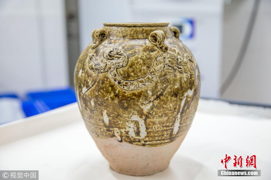 近日,廣東省博物館文物保護科技中心出水文物保護實驗室里,一個修復后的出水明代四系醬釉龍紋罐。譚慶駒 攝 圖片來源:視覺中國