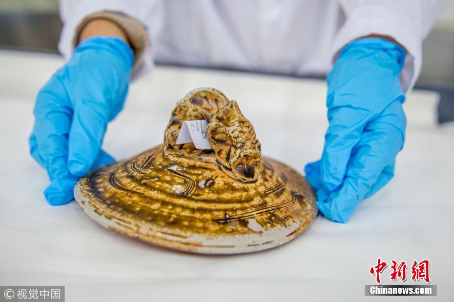 近日,廣東省博物館文物保護科技中心出水文物保護實驗室里,一件修復后的出水明代老虎醬釉罐的蓋子。譚慶駒 攝 圖片來源:視覺中國