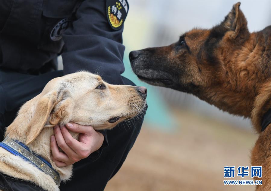 1月15日,即將組成春運搭檔的警犬“皮特”(左)和“哼哼”在進(jìn)行崗前磨合。 新華社記者 程敏 攝