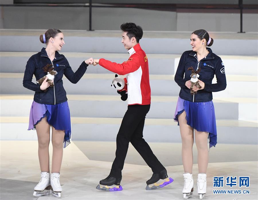 1月15日,中國花樣滑冰選手金博洋(中)與芬蘭運(yùn)動(dòng)員交流。 當(dāng)日,“2019中芬冬季運(yùn)動(dòng)年”開幕式在北京首鋼冰球館舉行。 新華社記者申宏攝