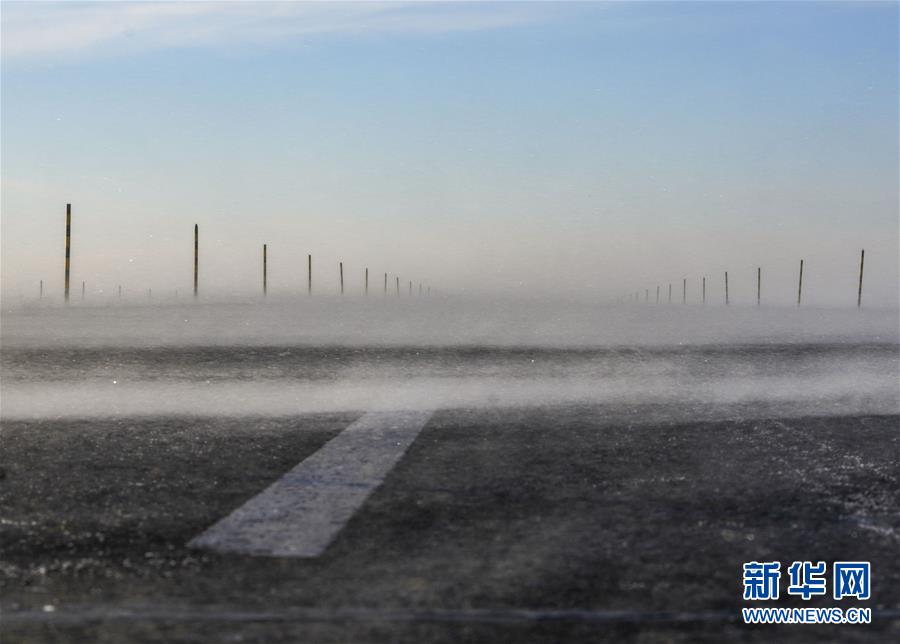 這是新疆瑪依塔斯風區(qū)內出現(xiàn)的“白毛風”現(xiàn)象(1月15日攝)。 瑪依塔斯風區(qū)位于新疆西北部額敏縣境內。這里東西風交替頻繁,一年大風天數超過150天,是世界上罕見的暴風雪災害地段。駐守在這里的新疆塔城公路管理局額敏分局瑪依塔斯應急保障基地,近年來連續(xù)裝備拋雪機等冰雪搶險救災裝備,有力地保障了這條道路的交通安全。 新華社記者趙戈攝