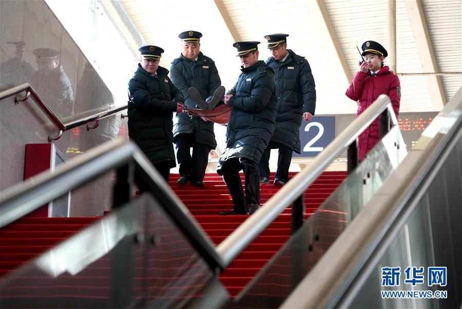 1月16日,鶴壁東站的職工在進(jìn)行列車下交重傷病旅客應(yīng)急演練。 當(dāng)日,中國(guó)鐵路鄭州局集團(tuán)有限公司新鄉(xiāng)車務(wù)段鶴壁東站組織職工開展服務(wù)禮儀、手語(yǔ)等業(yè)務(wù)培訓(xùn),并進(jìn)行非正常情況應(yīng)急演練,為2019年春運(yùn)做準(zhǔn)備。 新華社記者李安攝