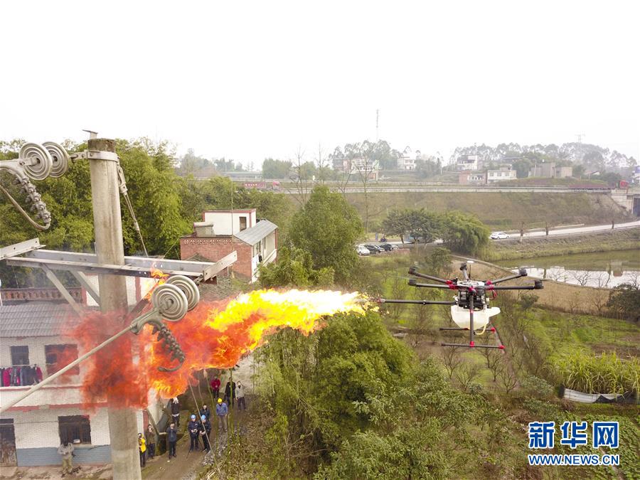 1月16日,噴火清障無人機(jī)在國網(wǎng)重慶永川供電公司無人機(jī)班操作手的控制下,對重慶市永川區(qū)大安街道小坎村10千伏隆安線16號桿處的一個(gè)馬蜂窩進(jìn)行噴火清除(無人機(jī)航拍)。 1月16日,經(jīng)過3年多的研發(fā)和測試,重慶首臺噴火清障無人機(jī)在國網(wǎng)重慶永川供電公司無人機(jī)班正式投用。這臺多旋翼無人機(jī),通過搭載帶有燃料箱、油泵、自動(dòng)點(diǎn)火裝置的噴火吊艙任務(wù)模塊,可以對影響高空電力線路安全的飄掛物進(jìn)行定點(diǎn)障礙清除作業(yè)。 據(jù)噴火清障無人機(jī)研發(fā)負(fù)責(zé)人何濤介紹,過去高空清除異物主要靠人工進(jìn)行,為保證安全經(jīng)常需要停電作業(yè),因此他們結(jié)合實(shí)際工作經(jīng)驗(yàn)和高空電力線路的自身特點(diǎn),設(shè)計(jì)和制造出了噴火清障無人機(jī)。2018年測試期間,國網(wǎng)重慶永川供電公司無人機(jī)班在多種環(huán)境下成功執(zhí)行了50多次高空電力線路清障作業(yè)。 新華社記者 劉潺 攝