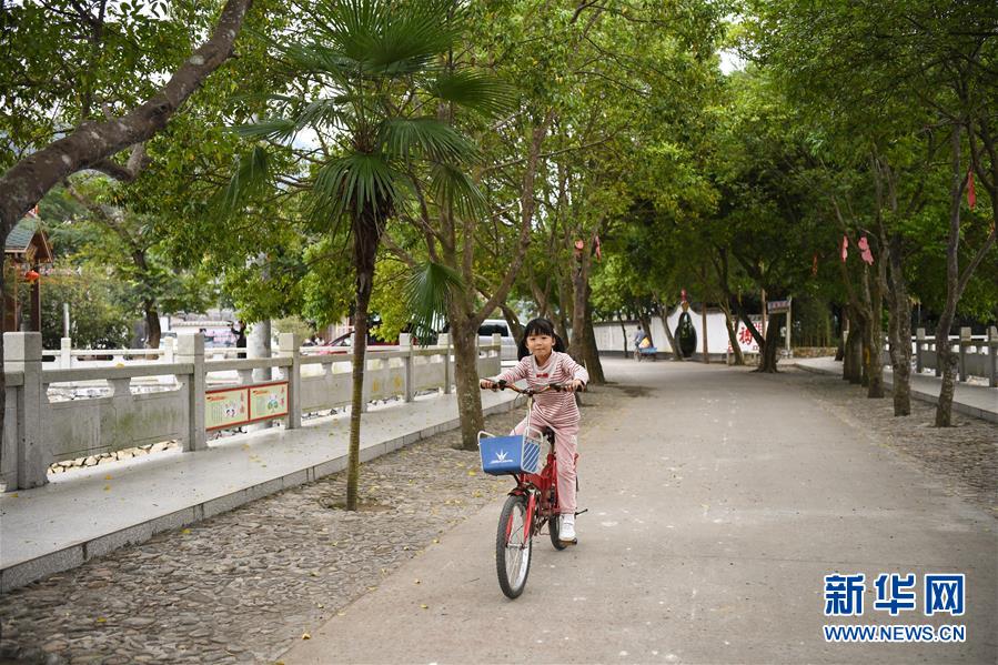 小朋友在廣東清遠(yuǎn)英德市九龍鎮(zhèn)活石水村騎行(2018年11月14日攝)。