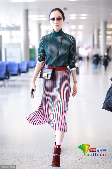 2019年1月17日,上海,韓雪現(xiàn)身機場,穿著條紋紗裙露出小腿,十分抗凍,她搭配經典的駝色大衣,氣質出眾在機場人群中相當搶鏡。