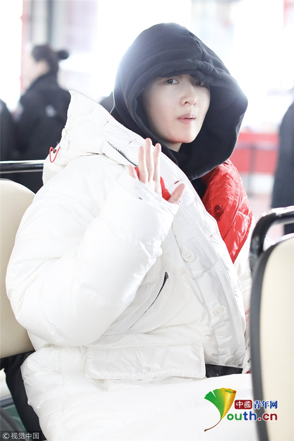 1月23日,北京,周冬雨現(xiàn)身機(jī)場。她用黑色連衣帽罩頭襯托巴掌臉,把下巴擱在行李車推桿上的雙手上呆萌可愛 。