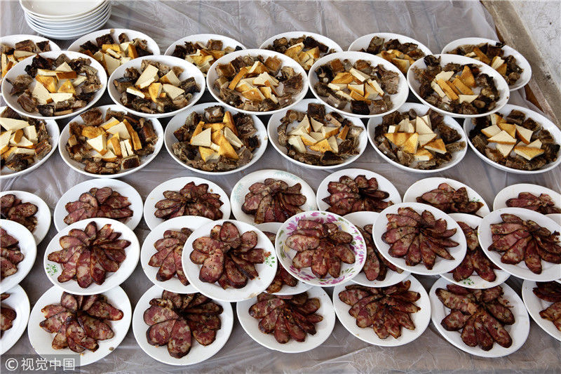 2019年1月26日,重慶中山古鎮(zhèn),880桌“千米長(zhǎng)宴”5萬(wàn)人共品年味。880多張席桌在老街屋檐下一字?jǐn)[開,“千米長(zhǎng)宴”正式開席。周智勇/視覺中國(guó)