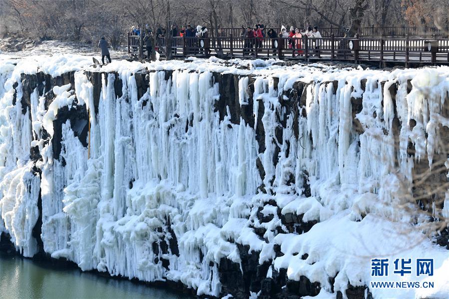 2月25日,游客在觀賞冰瀑景觀。 去冬今春以來(lái),黑龍江省鏡泊湖的吊水樓冰瀑景色壯觀,吸引許多游人前來(lái)觀賞。 新華社記者 王建威 攝