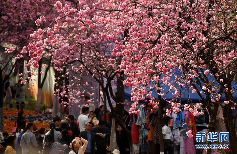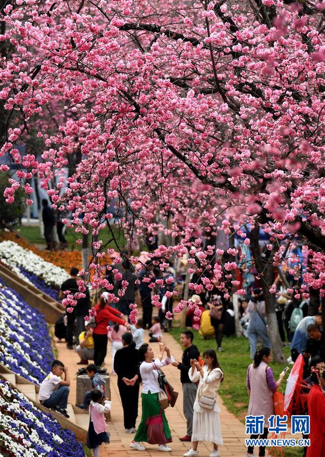 游人在昆明圓通山公園觀賞盛開的櫻花(3月16日攝)。近日,云南省昆明市迎來櫻花盛開的時(shí)節(jié)。昆明圓通山公園的數(shù)千株櫻花燦爛綻放,吸引了市民和游客前來觀花賞景。新華社記者秦晴攝