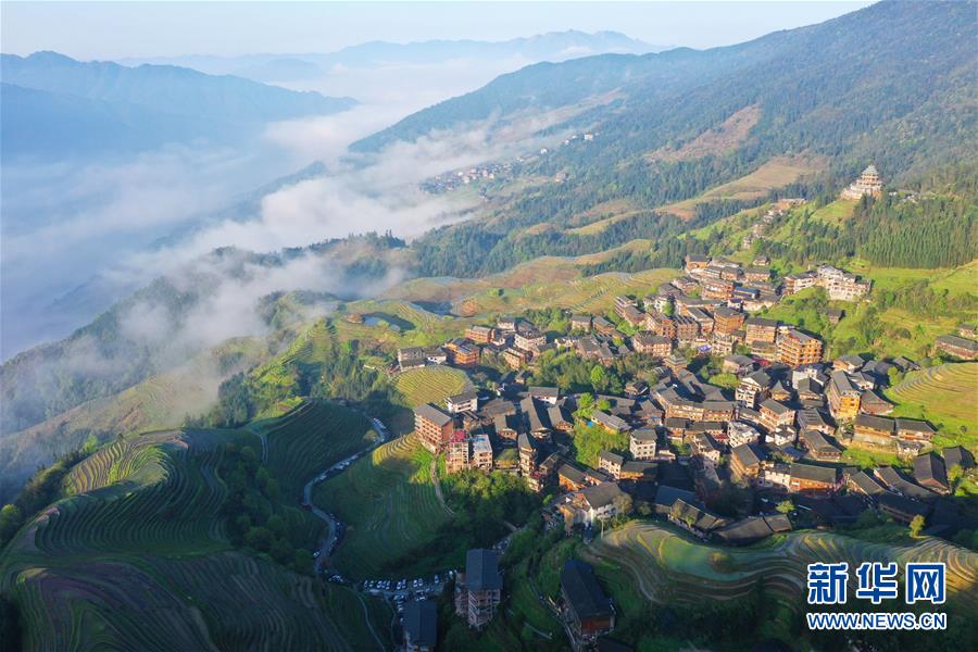龍勝各族自治縣和平鄉(xiāng)平安村一景(4月7日無人機拍攝)。連日降雨過后,廣西龍勝各族自治縣和平鄉(xiāng)平安村的壯族村寨迎來久違的朝陽。 新華社記者 曹祎銘 攝