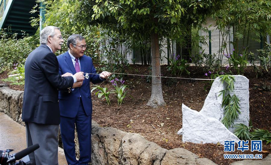 4月6日,在美國圣迭戈動物園,中國駐洛杉磯總領(lǐng)事張平(右)為“大熊貓保護項目”紀(jì)念碑揭幕。新華社記者李穎攝