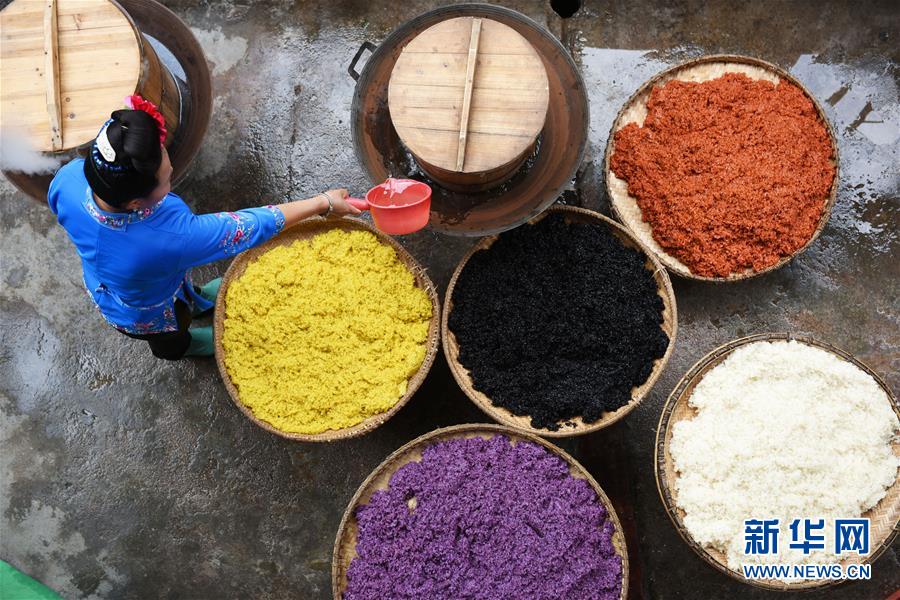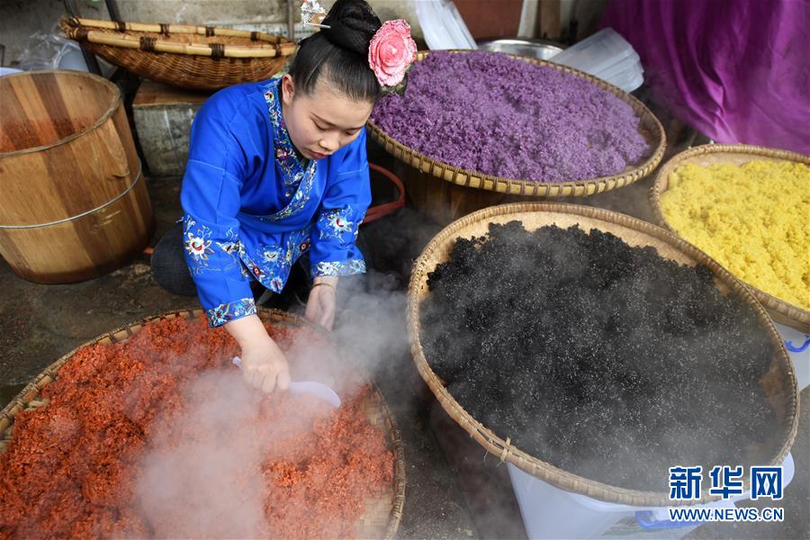 4月17日,在貴州省臺(tái)江縣姊妹街哆蝶五彩姊妹飯?bào)w驗(yàn)店,苗家婦女將蒸熟的五彩“姊妹飯”進(jìn)行攤晾。 新華社記者 楊文斌 攝