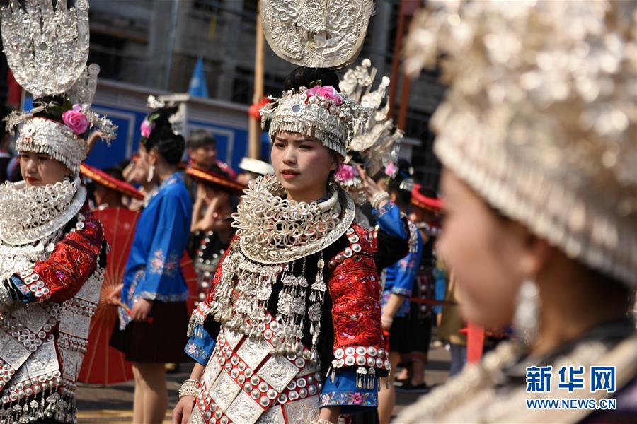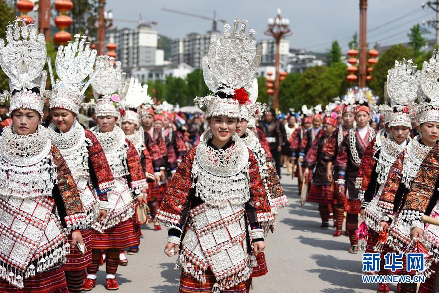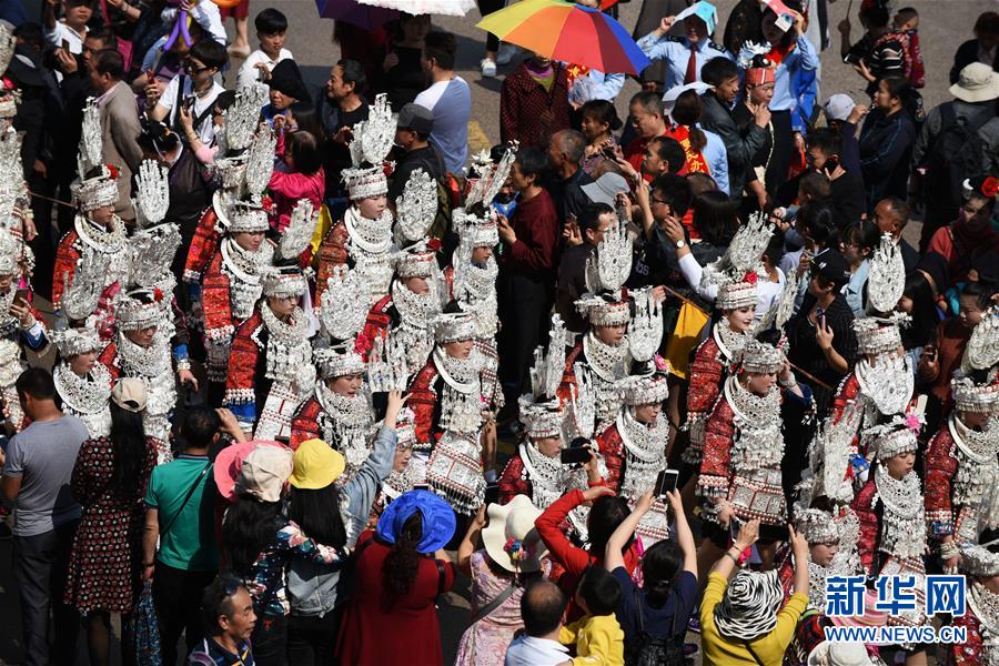 4月18日,臺(tái)江縣苗族群眾參加盛裝游演活動(dòng)。 當(dāng)日,貴州省黔東南苗族侗族自治州臺(tái)江縣迎來(lái)一年一度的苗族姊妹節(jié)。節(jié)日期間將舉行苗族盛裝游演、千人長(zhǎng)桌宴、千人游方體驗(yàn)、苗族手工創(chuàng)意大賽等一系列活動(dòng)。 姊妹節(jié)是臺(tái)江縣苗族同胞的傳統(tǒng)節(jié)日,2006年被列入第一批國(guó)家級(jí)非物質(zhì)文化遺產(chǎn)名錄。 新華社記者 楊文斌 攝