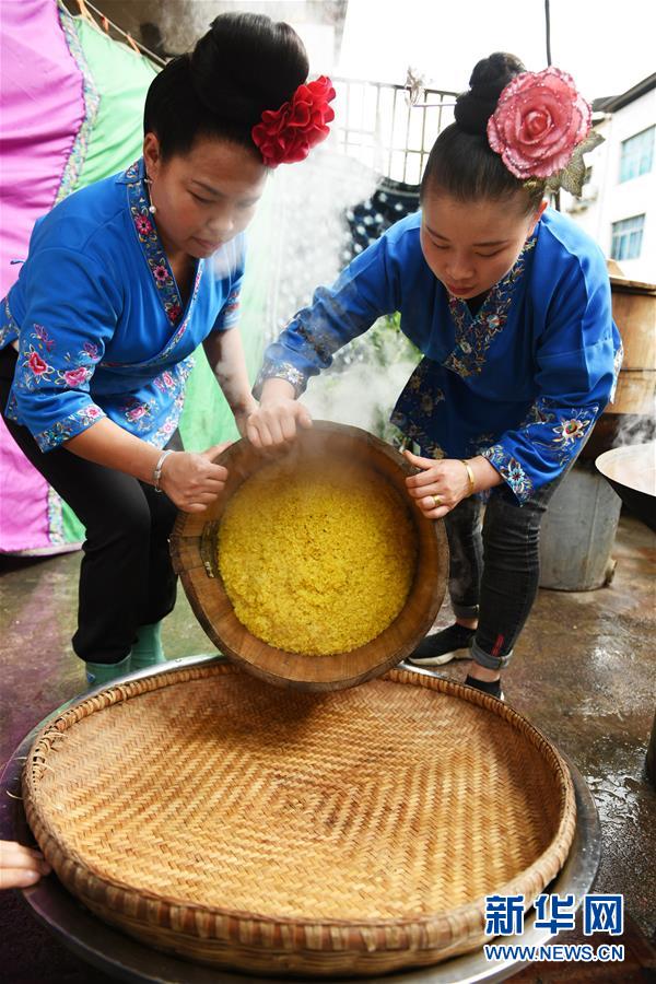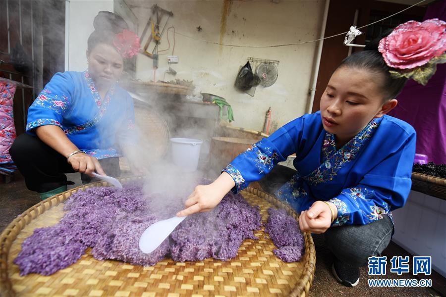 4月17日,在貴州省臺(tái)江縣姊妹街哆蝶五彩姊妹飯?bào)w驗(yàn)店,苗家婦女將蒸熟的五彩“姊妹飯”進(jìn)行攤晾。 新華社記者 楊文斌 攝