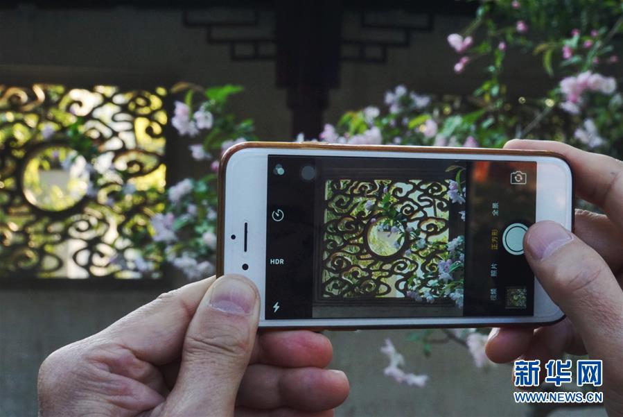 2019年4月1日,一名游客在中國蘇州耦園內拍照。2000年,耦園和滄浪亭、藝圃、獅子林、退思園作為蘇州古典園林的擴展項目被列入聯(lián)合國教科文組織世界文化遺產名單。 新華社記者杜涓涓攝