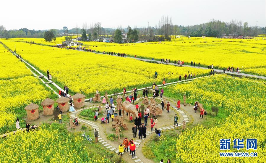 在四川都江堰市柳街鎮(zhèn)七里詩(shī)鄉(xiāng),游客在油菜花地里休閑游玩(3月16日無人機(jī)拍攝)。 新華社記者 江宏景 攝