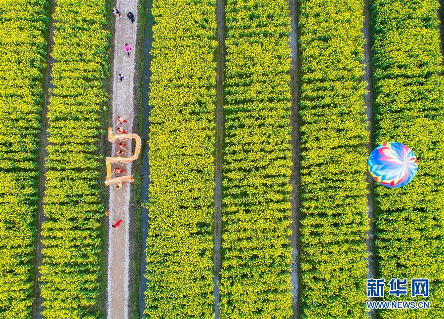 村民舞龍隊(duì)在浙江省湖州市吳興區(qū)八里店鎮(zhèn)移沿山生態(tài)景區(qū)的油菜花田里表演舞龍(3月30日無人機(jī)拍攝)。 新華社記者 徐昱 攝