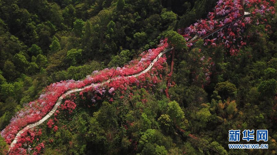 安徽省岳西縣天峽風(fēng)景區(qū)內(nèi)的杜鵑花競(jìng)相綻放(4月12日無人機(jī)拍攝)。 新華社記者 張端 攝