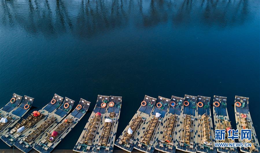 這是福建省武夷山風(fēng)景名勝區(qū)九曲溪邊停靠的竹筏(3月11日無人機(jī)拍攝)。 新華社記者 宋為偉 攝