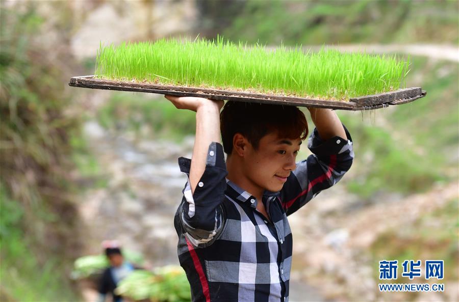 在黔桂烏英苗寨,村民搬運秧苗去插秧(4月17日攝)。  新華社記者 黃孝邦 攝