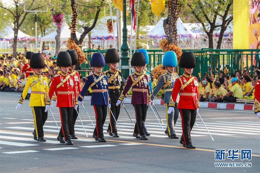 5月5日,儀仗隊在曼谷大王宮附近舉行的泰國國王加冕典禮巡游上列隊前進。 新華社記者 張可任 攝
